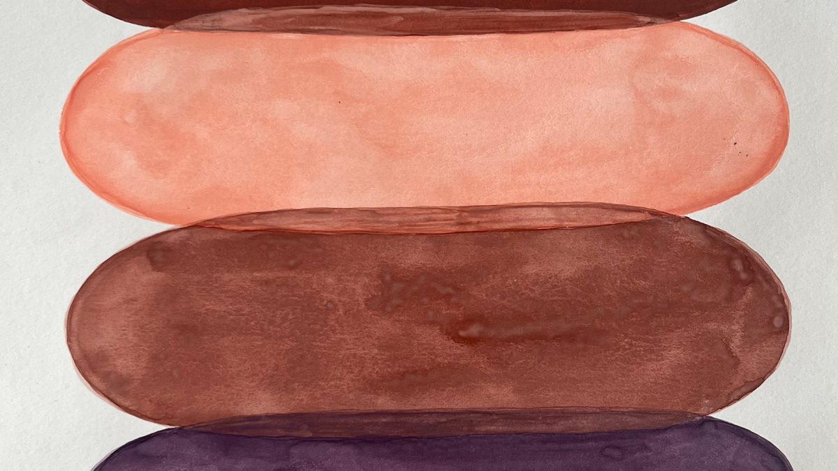 I have made the paintings in my exhibition with homemade watercolors on paper. I have also made some of the pigments that form the basis of the watercolors myself from various plant materials. However, most of the pigments come from painting supply stores, and to some extent I have also used old pastel chalks that I have ground into powder as pigments. Gum arabic and honey mixed with water have served as binders for the pigments in the watercolor buttons I have made.