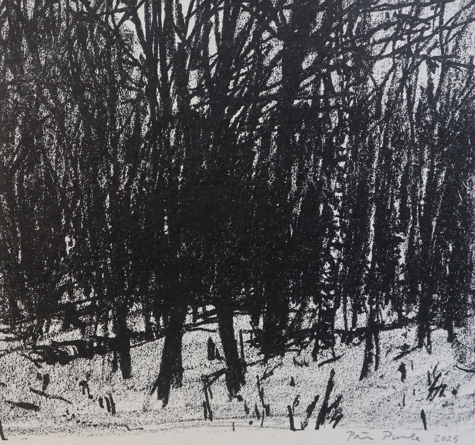 Päivi Pussilan hiilipiirustuksista ja litografioista koostuva näyttely jatkaa taiteilijan jo muutama vuosi sitten aloittamaa sarjaa Metsä on.