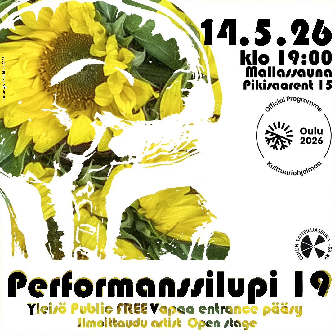 Performanssilupi on osa Oulu2026-kulttuuriohjelmaa ja kulttuuri-ilmastonmuutosta. Oulun Taiteilijaseura -63 ry:n jäsentaiteilijoiden luotsaama tapahtuma tulee pikapuolin viiden vuoden ikään – siitä lähemmin lumiajan mentyä. Nyt Open Stage -periaatteella toimivan lupin artistit kutsuvat jälleen mukaan ihan kaikkia. Tule kannustamaan, kokemaan, jakamaan ja virkistymään Pikisaaren Mallassaunan ennakkoluulottomaan ilmapiiriin. Lukuisa joukko kansalaisia on uskaltautunut estradille kuluneiden vuosien aikana. Tule sinäkin.